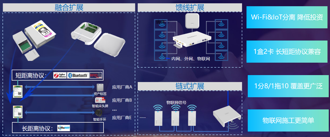 信锐提供的无线物联网融合方案(图二),采用无线Wi-Fi网络扩展物联网单元、馈线复用等方式,支持多种协议(如蓝牙、RFID、LoRa、ZigBee等)的物联网应用扩展,实现联接标准化,避免了因使用不同厂家的物联网网关导致的重复部署和投资。